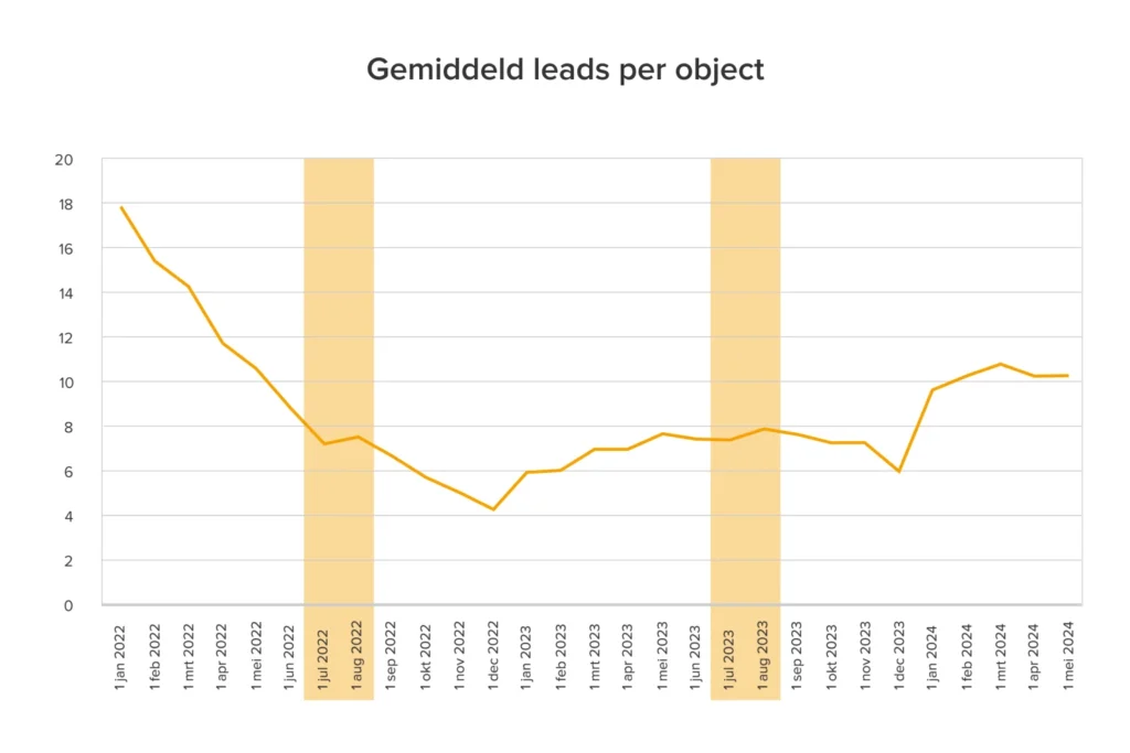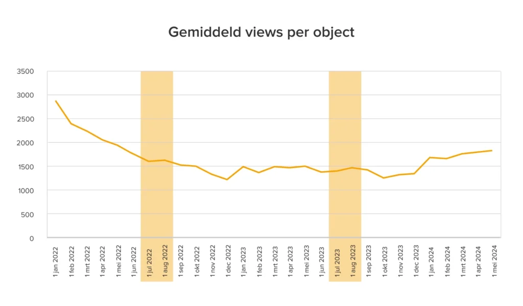Zo zagen we tot eind 2022 een aanzienlijke daling in het aantal contactaanvragen met makelaars. In 2023 was er een herstel, maar ook hier waren er geen significante veranderingen in de zomer. Sterker nog, in augustus nam het aantal contactaanvragen juist iets toe.